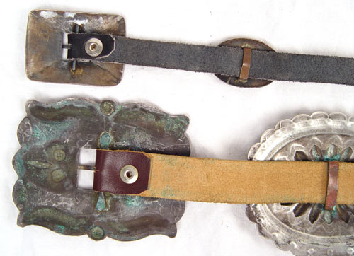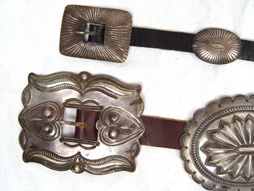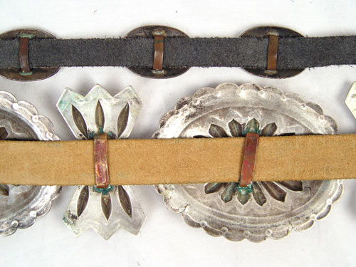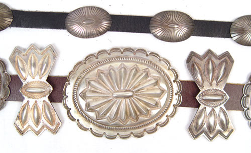 2 NATIVE AMERICAN SILVER CONCHA BELTS: To include 1) Alternating stamped medallion and bow designs. Medallions measure 4 1/4'' x 3 1/4''. 2) Smaller stamped medallions with sunburst design. Measure 1 5/8'' x 1 1/8''. Neither is marked. Acid tests between .800 and .925 silver. Approx 30.6 troy oz, note weighed with leather belts.