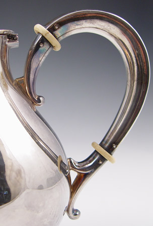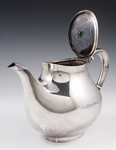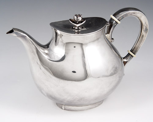 STERLING TEAPOT: Hinged lid with rose form finial. Bone rings on applied handle. Unknown makers hallmark with 925 Sterling. Measures 5 5/8'' high x 8 1/2''. Note several small dents. Approx. 15.7 troy oz.