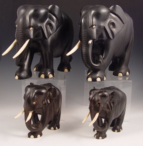 4 EBONY ELEPHANTS WITH BONE TUSKS & TOES: 2 large and 2 smaller elephants, carved from ebony. Note cracks, missing tusk and toes. Large measures approx. 10'' high x 13 1/2'' x 6'', small measures approx. 6'' high x 8'' x 4''. Total weight approx. 29.5 lbs.
