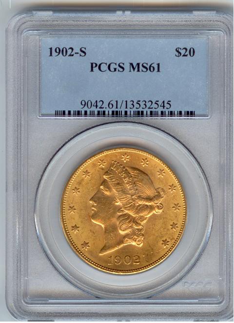 1902-S $20 GOLD DOUBLE EAGLE PCGS MS61: PCGS Graded MS 61. Please see our other gold coins.