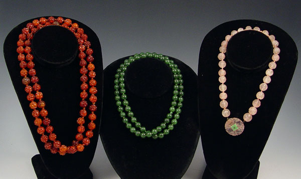 ESTATE CARVED AMBER, CARVED QUARTZ, AND JADE BEADS: Group of three necklaces. 1) Carved amber beads, 44''. 2) Carved quartz, 16 1/2'' 3) Jade ? beads, 32'' long.