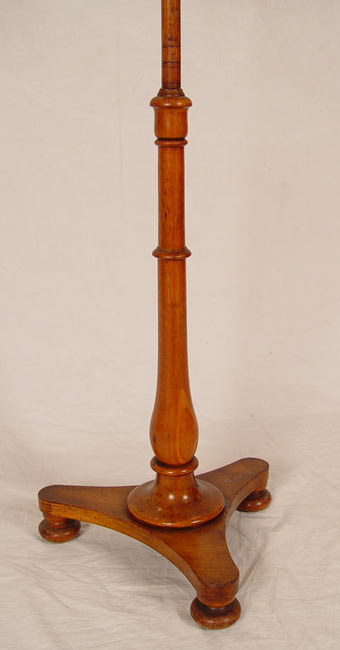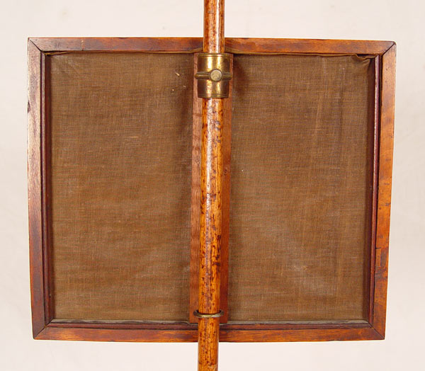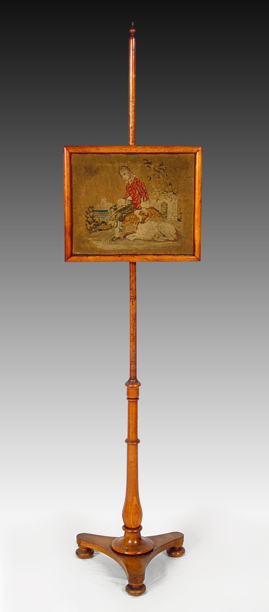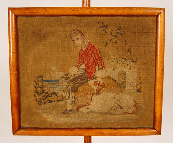 EARLY 19TH CENTURY CHERRY POLE FIRE SCREEN: Finely detailed petty point needlework depicting landscape with man & dog. Nice condition. Measures 59'' h. x 14'' x 12 1/2''