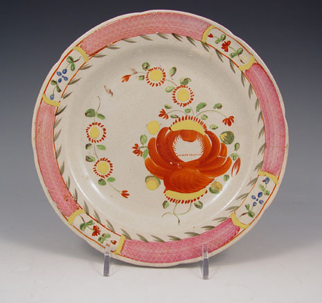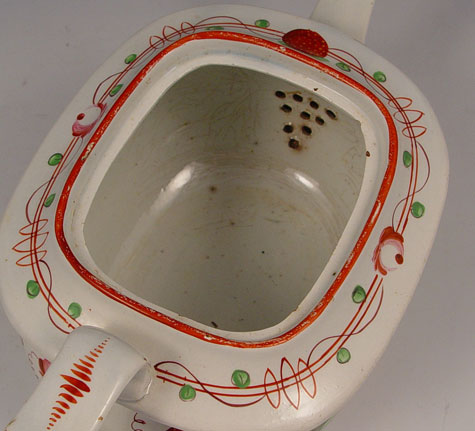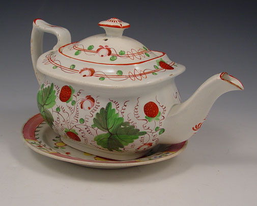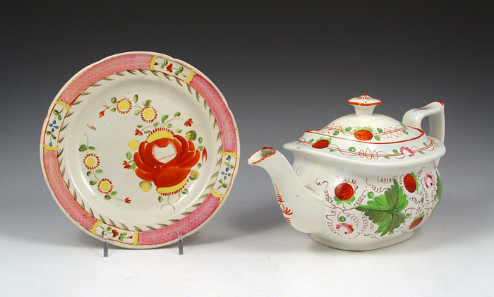 SOFT PASTE TEAPOT AND PLATE: Hand painted Strawberry teapot, 5''h., and Rose plate, 7' dia.