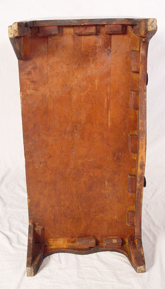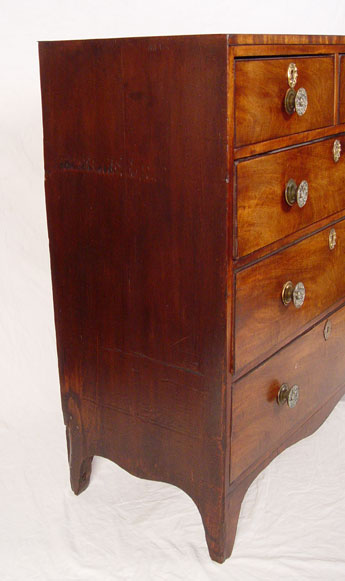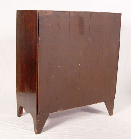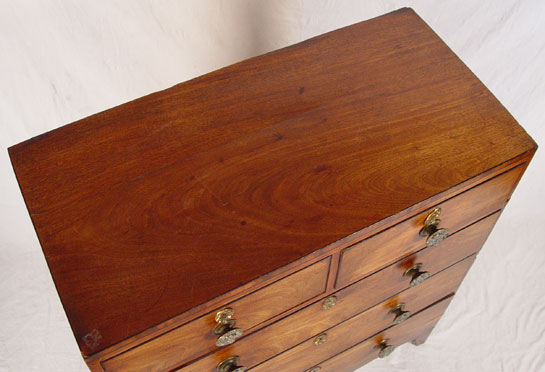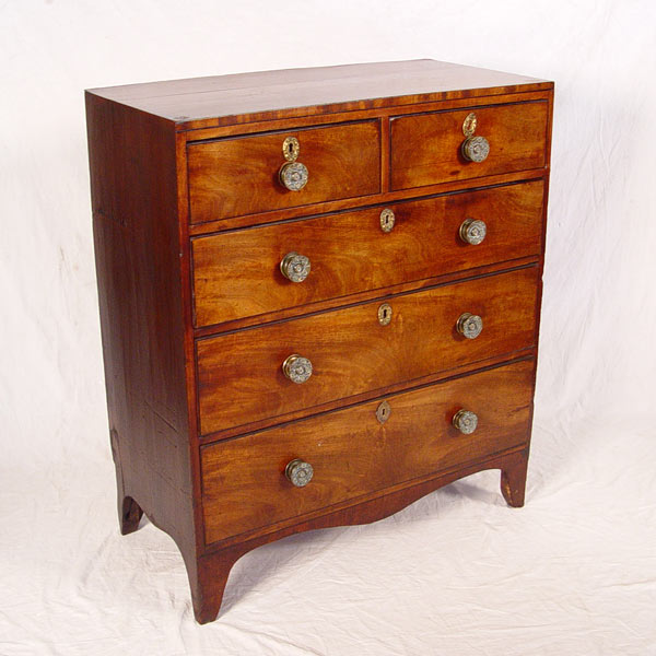 SHERATON PERIOD CHEST OF DRAWERS: Richly grained 2 over 3 drawer chest, tall leg cut outs, hollow brass pulls, nice condition and finish. No missing glue blocks. Measures 41 3/4'' high x 35 3/4'' x 17 3/4''