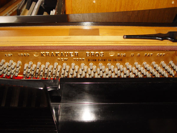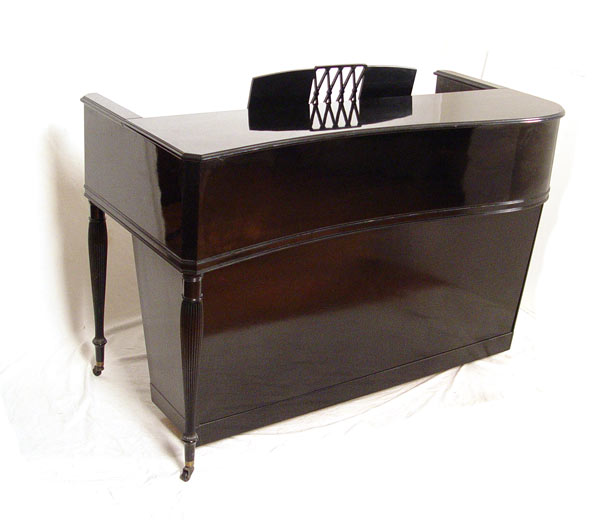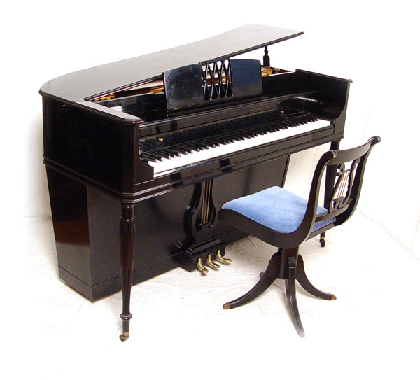 1950'S KRAKAUER SERENADE CONSOLE PIANO AND SEAT: Circa early 1950's Serenade model, serial number 65494, with polished ebony finish. Award winning piano design, with grand piano type cover and sound. 3 reeded spinet legs. Measures 38 1/4'' high x 60'' x 29''. Sold with black finish chair, measures 34'' high x 15 1/4'' x 20''