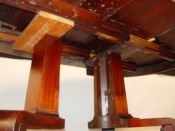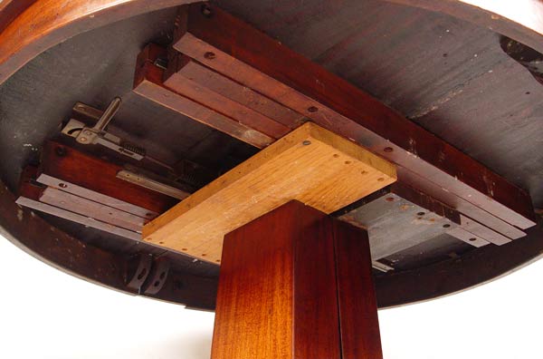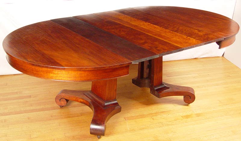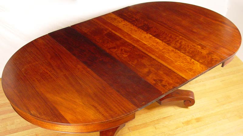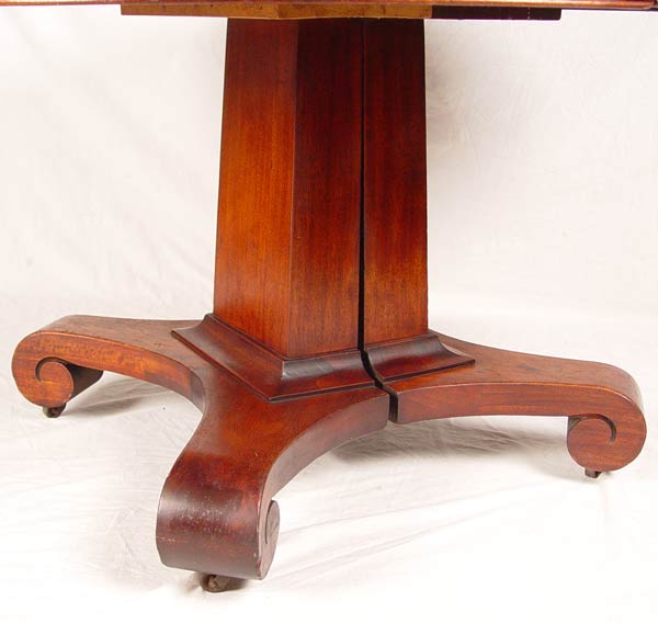 EMPIRE ROUND MAHOGANY TABLE WITH 4 LEAVES: Single pedestal splits to accept the 4 leaves. Measures 29 3/4''h. x 48 1/2'' dia. Sold with the 4 leaves, 9'' wide.