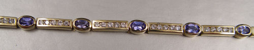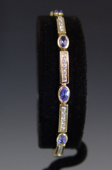 14K TANZANITE & DIAMOND BRACELET: 14K yellow gold bracelet contains ten oval shaped cabochon cut tanzanite. Weight: 5.00 Ct. Approx. The tanzanite is rated VVS in clarity (Type I), vB in Hue, 3-4 in Tone and 3 in Saturation. Fifty round brilliant cut diamonds. Weight: 2.00 Ct. Approx. The diamonds average SI-I1 in clarity and H-I in color. The tanzanite are bezel set. The diamonds are channel set. Weight: 12.4 grams. Length: 7''