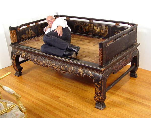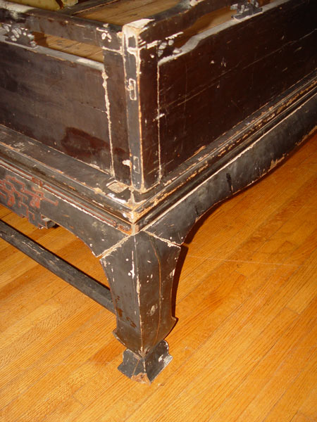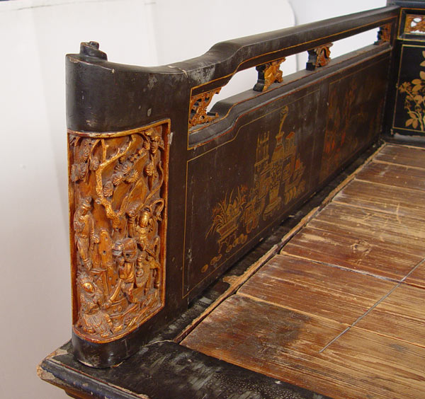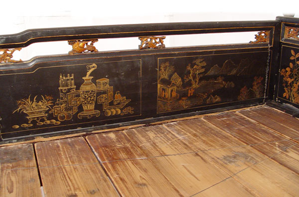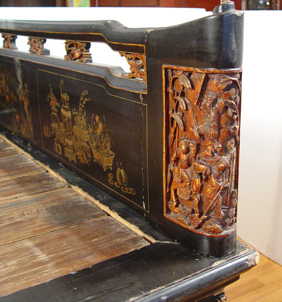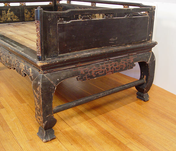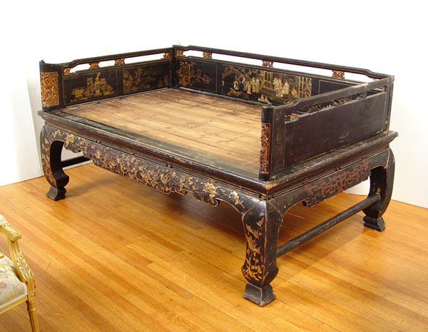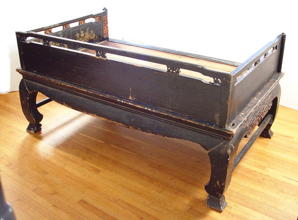19th C CHINESE DECORATED LACQUER PLATFORM BED: Original paint in worn condition. 39 1/2'' high x 82 1/2'' x 38 1/2''