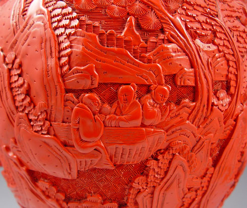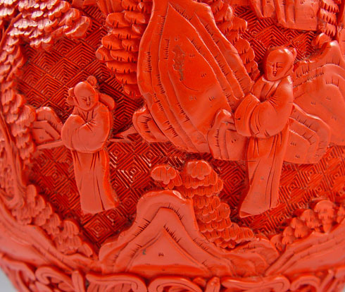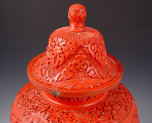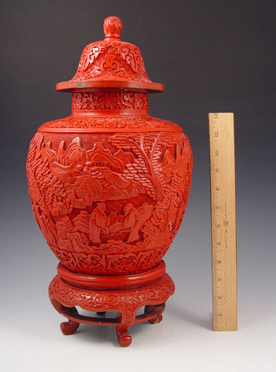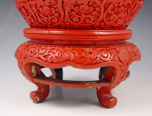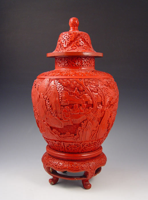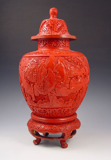 1880 CHINESE CINNABAR COVERED URN ON STAND: Measures 17 1/4'' h. x 8 1/2'' dia.