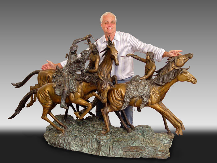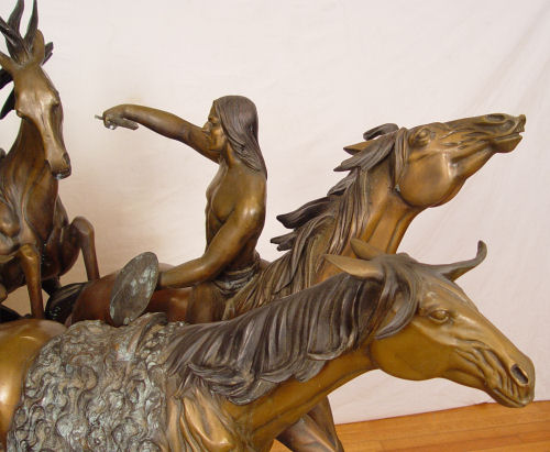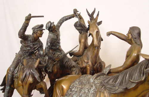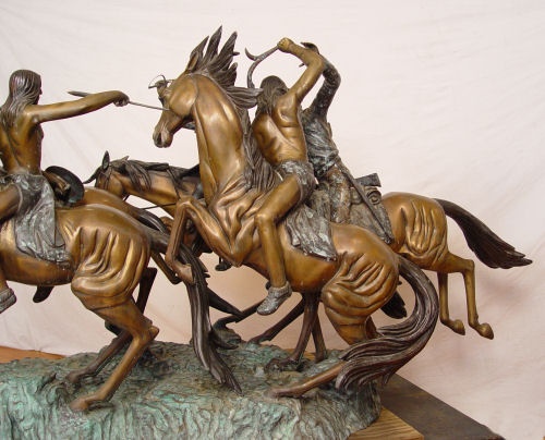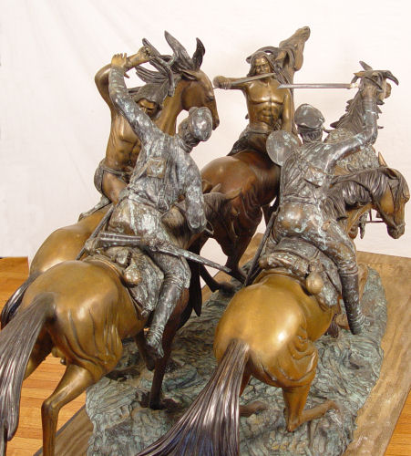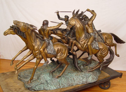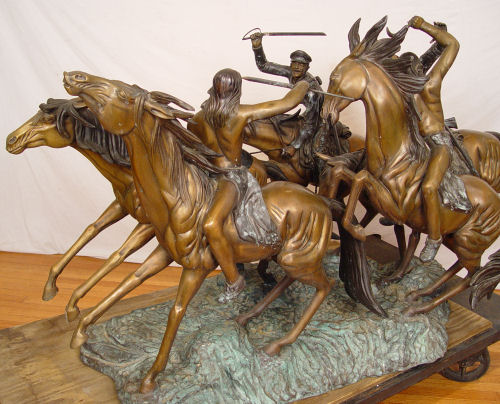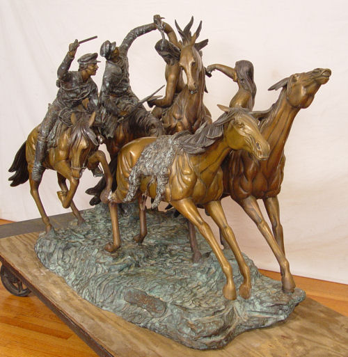 KELIAM, S. BRONZE: Huge bronze statuary depicting a battle on horseback with NAtive American Indians versus US Soldiers, 5 horses, 4 riders. 6 1/2 ft long x 44'' tall. Signed S. Keliam and numbered 2.
