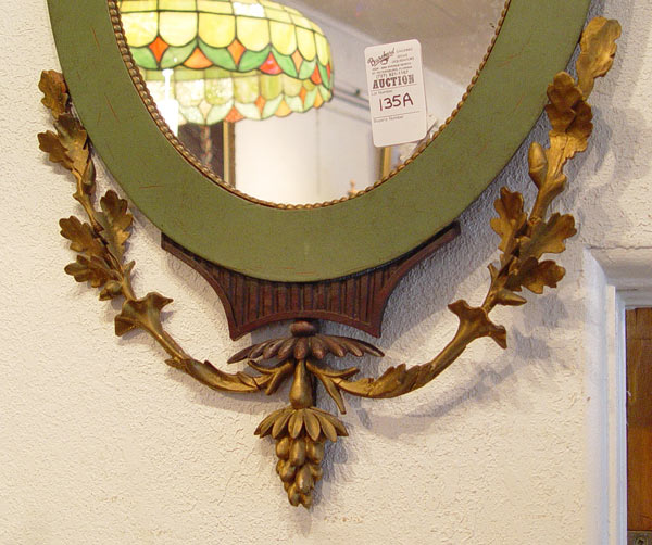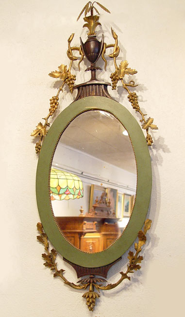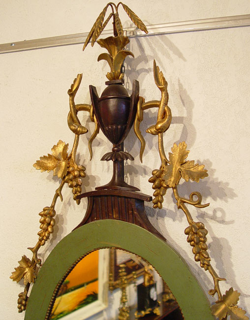 OVAL GILT WOOD MIRROR WITH URN CREST: Painted mahogany frame, gilt gesso grape vines pour from the mahogany urn. The looking glass is 20 1/2'', the mirror is 47'' x 18'' overall. Please call for condition.