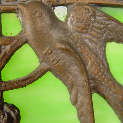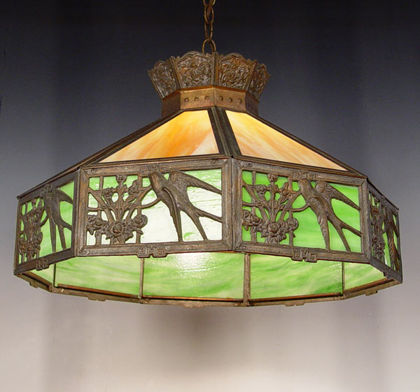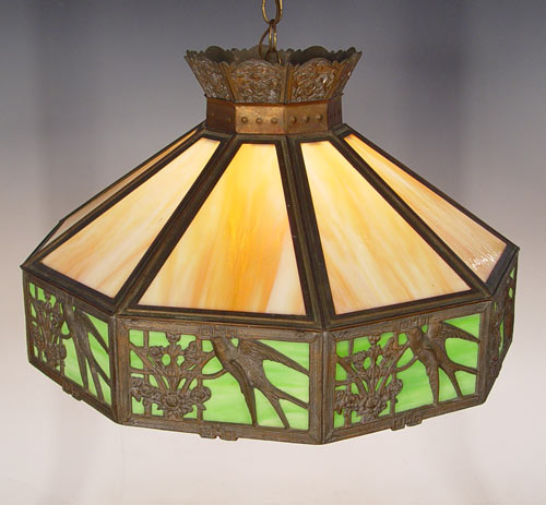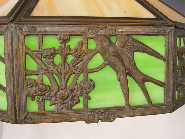VINTAGE 9 PANEL SLAG GLASS CEILING LAMP: Conical shape, 9 panels of caramel slag glass over green panels, bird motif filigree metal over the green. 22 1/2'' dia.