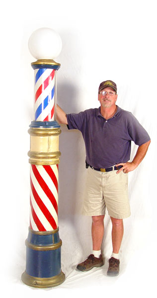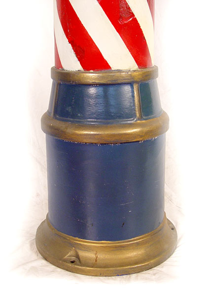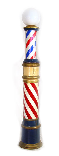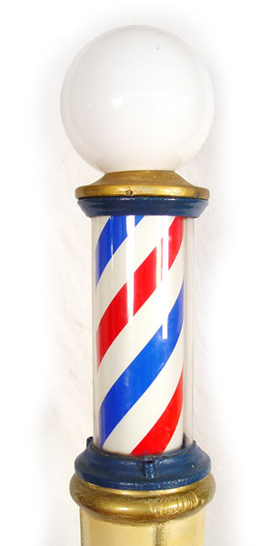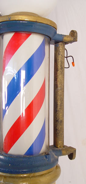 ANTIQUE ELECTRIFIED BARBER SHOP POLE: Painted porcelain over metal base with electrified top. Measures approx. 88'' high to top of replacement glass globe X 16'' base dia. Circa 1930's.