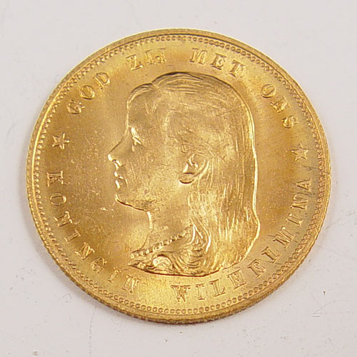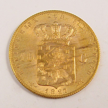 1897 NETHERLAND 10 GULDEN GOLD COIN: 1897 mintage. MS 64+ sticker on case, however we do not know who graded this coin, and do not guarantee this grading. Approx 6.7 grams .900 gold.