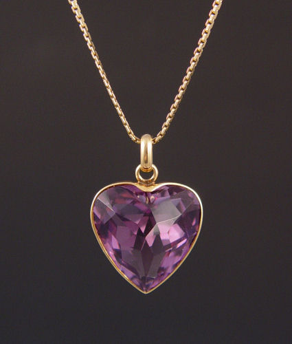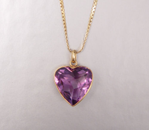 20 CT HEART SHAPED AMETHYST PENDANT: 14K yellow gold pendant contains one hear shaped mixed cut amethyst. Weight: 20.00 Ct. Approx. The amethyst is bezel set and dangles from a 14K yellow gold 24'' ''C'' chain. Weight: 11.2 grams.