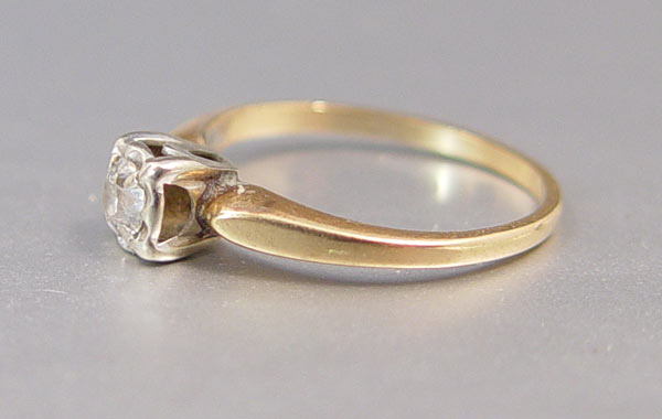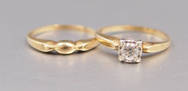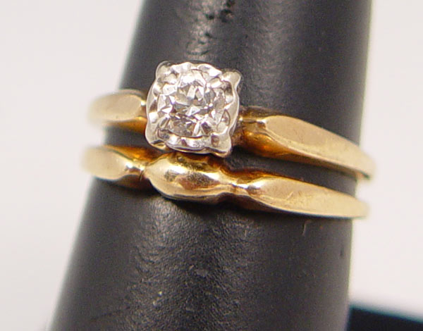 14K BRIDAL SET: 14K yellow gold bridal set with one old European round cut diamond, approx. .20 ct, rated VS2 in clarity and H-I in color. The diamond is prong set. Size 5.5. Weight 3.9 grams.