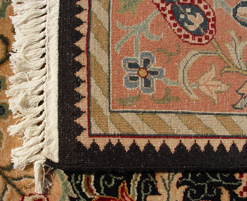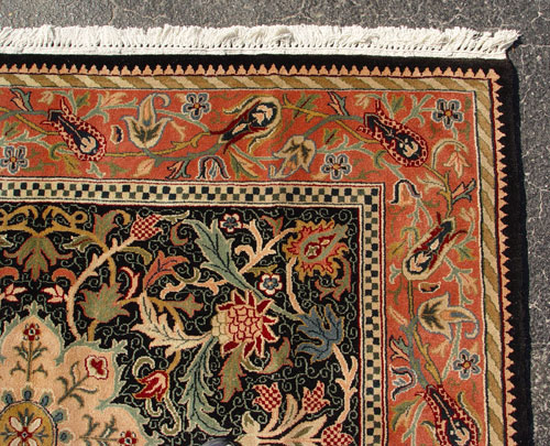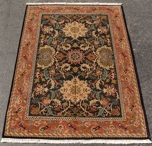 FINE HAND TIED CONTEMPORARY TABRIZ CARPET: Approx. 9' 3'' x 6' 5'', black ground, rust border.