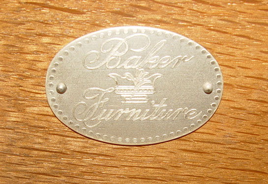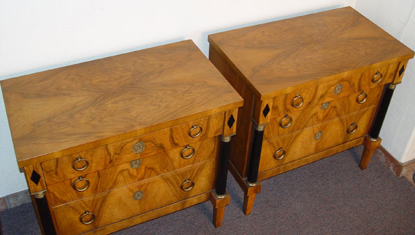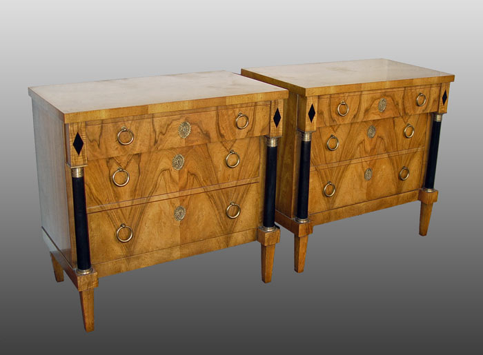PAIR BAKER NEO-CLASSICAL STYLE 3 DRAWER CHESTS: Matching pair of chests, black columnar stiles, Baker metal tag inside drawer. 31 3/4'' high x 33 1/2'' x 19 1/4''