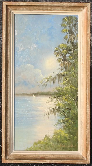 McLENDON, Roy, (American, 20th C): Florida Highwaymen river scene with sailboat, Oil/Upson, 24'' x 12'', white washed and painted frame, 27'' x 14 3/4''.