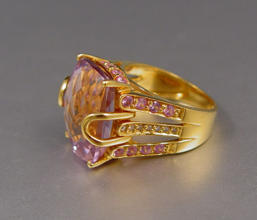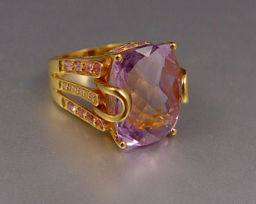 12 CT CUSHION CUT AMETHYST RING WITH PINK SAPPHIRES AND DIAMONDS: 22K yellow gold ring featuring a 12 ct cushion cut amethyst, VVS in clarity, P hue, 2 tone and 2 in saturation. The shank contains 24 round shaped mixed cut pink sapphires, approx. 1 Ctw. and 14 round single cut diamonds, approx. .10 Ct. Weight 9.4 grams. Size 5. Sold with current Florida Diamond Appraisers GIA graduates appraisal for $1.595.