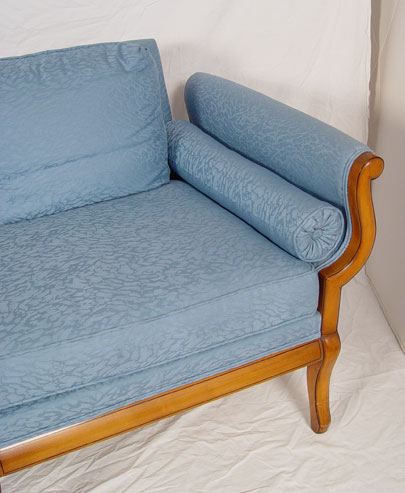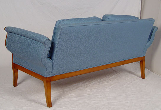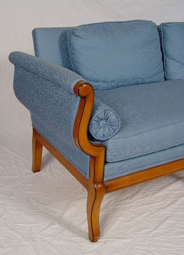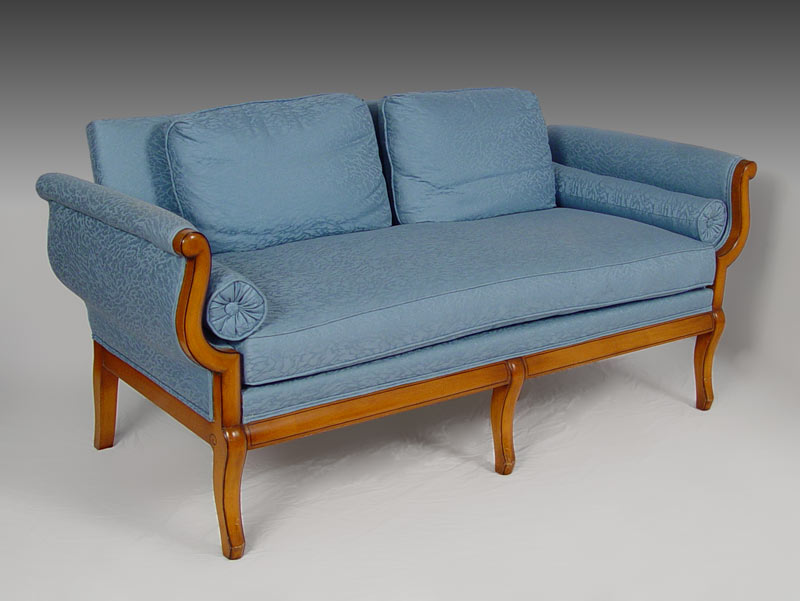 NEO-CLASSICAL / BIEDERMEIR STYLE SOFA: Single horse hair seat cushion, down cushions on the back. The curvy frame is outlined in black. Measures 31'' high x 66 3/4'' long x 31''