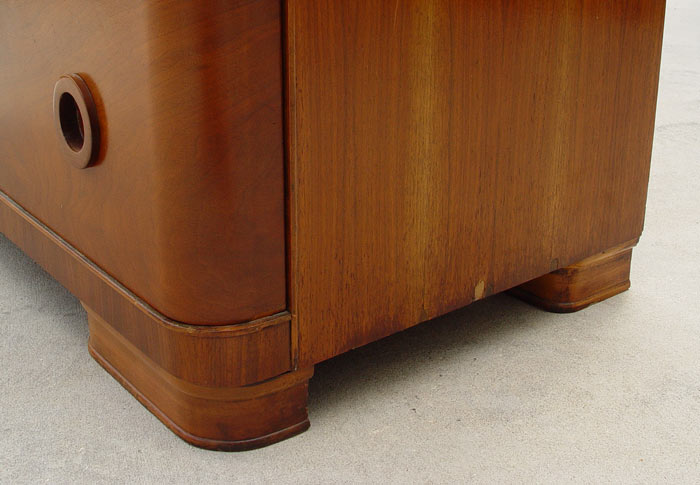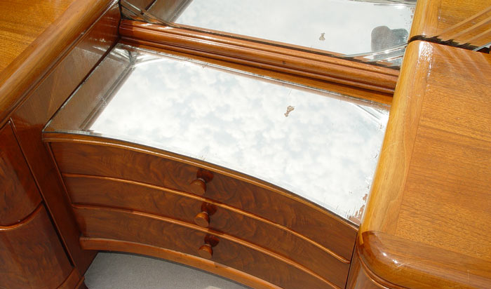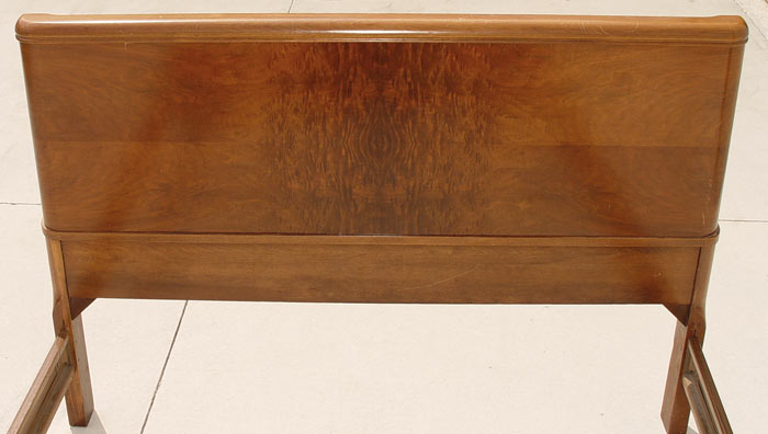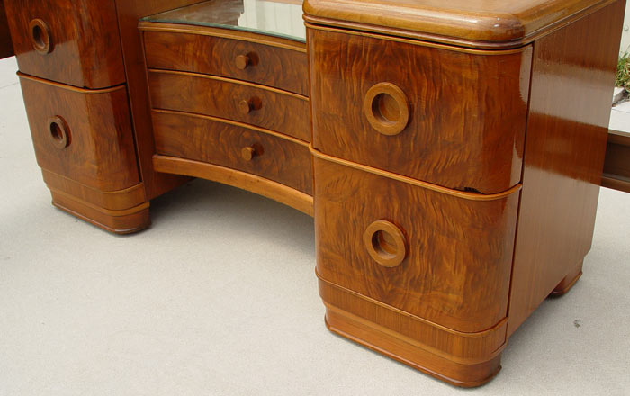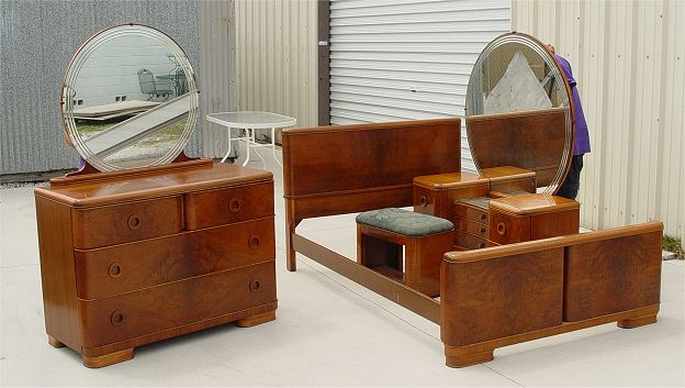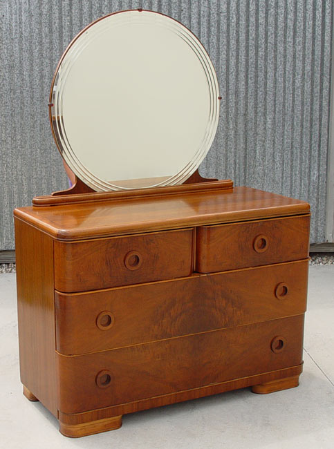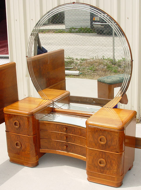 4 PIECE ART DECO BEDROOM SET: To include Full size BED, VANITY with round mirror and BENCH, DRESSER with round mirror. Hanover Cabinet Co., richly grained burl walnut. Beautiful refurbished condition with minor veneer loss.