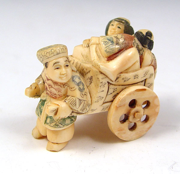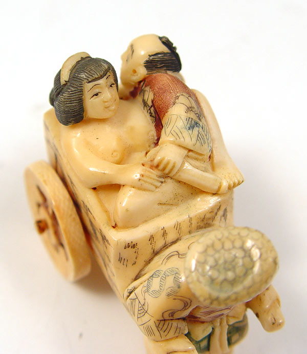 JAPANESE CARVED IVORY RICKSHAW EROTICA NETSUKE: Figure of man and nude woman in erotic position with man pulling rickshaw. Signed on base in characters. Measures 1 3/4'' high x 2''