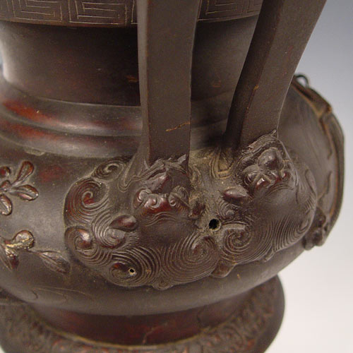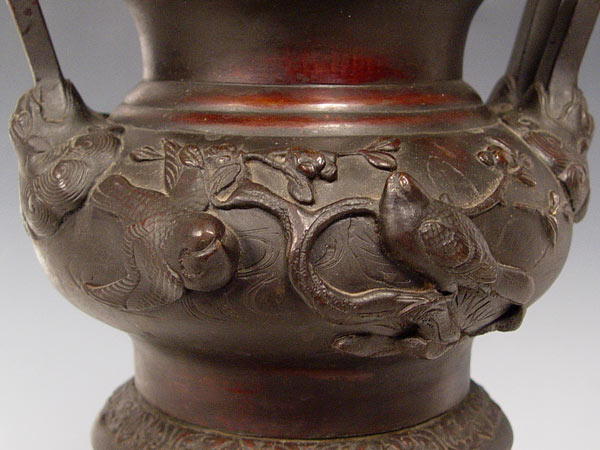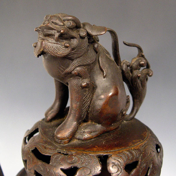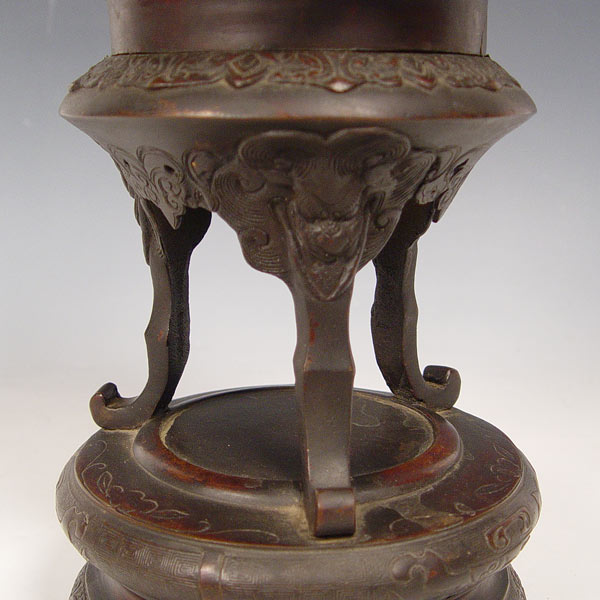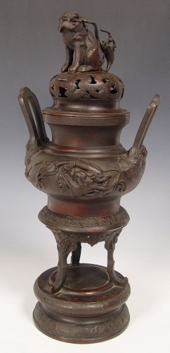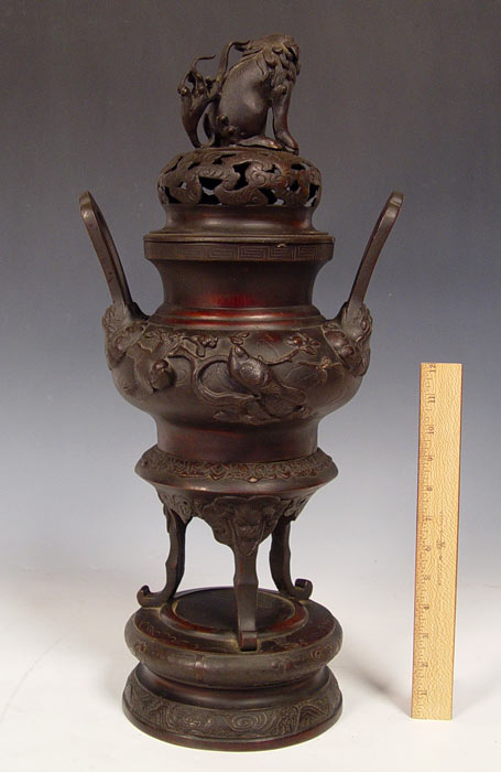 JAPANESE BRONZE KORO / CENSOR: Ca. 1868-1911, late Meiji period. Three parts with the upper having a Foo dog finial, middle with a raised bird design. 22'' tall overall.