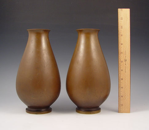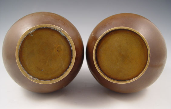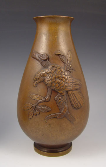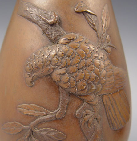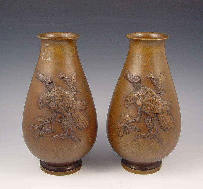 PAIR JAPANESE BRONZE VASES: Raised design of falcons perching, unsigned, 9 1/2'' h. x 5'' dia.