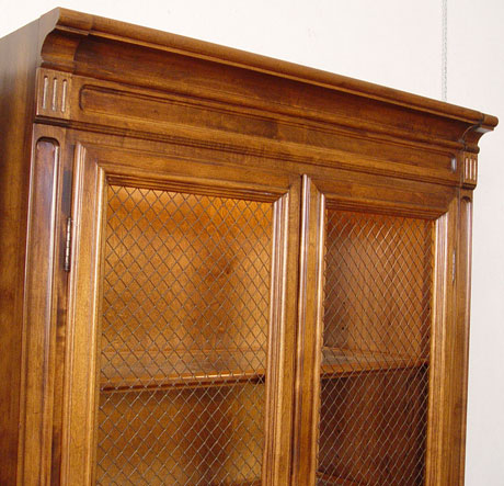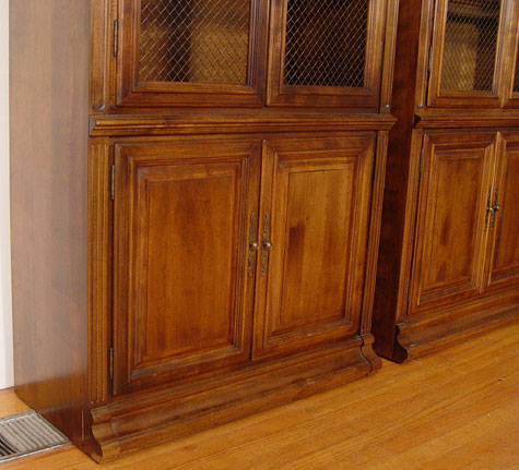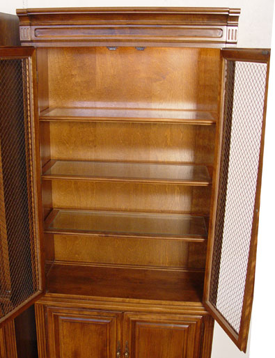 MATCHED PAIR OF TWO ETHAN ALLEN BOOKCASE CABINETS: Illuminated interior, adjustable glass and wood shelves behind the mesh metal doors. Measure 78 1/2'' h. x 34'' x 16 1/4''