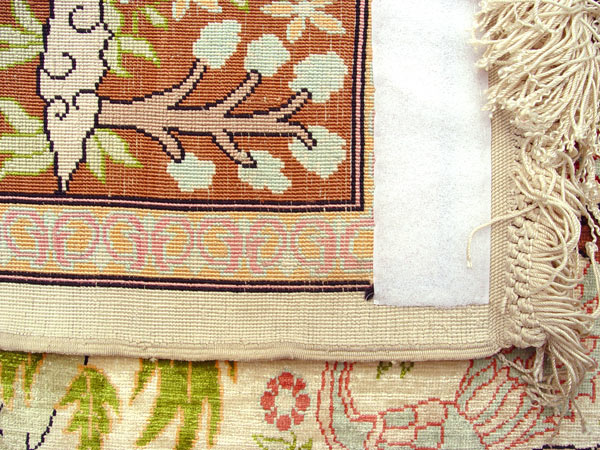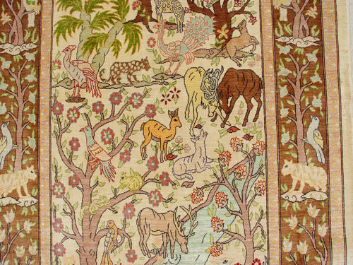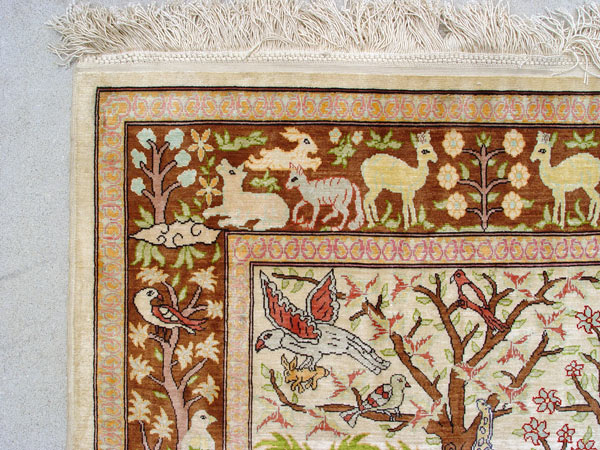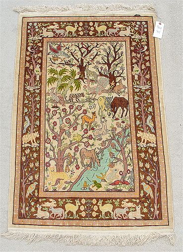 TURKISH HEREKEH SILK ORIENTAL RUG WITH ANIMAL FIGURES: Approx. 37'' x 31 1/2''