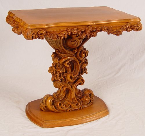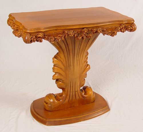 20TH C. HEAVILY CARVED MAPLE PEDESTAL TABLE: Carved to death base and table edge. Measures 29'' h. x 32'' x 19''