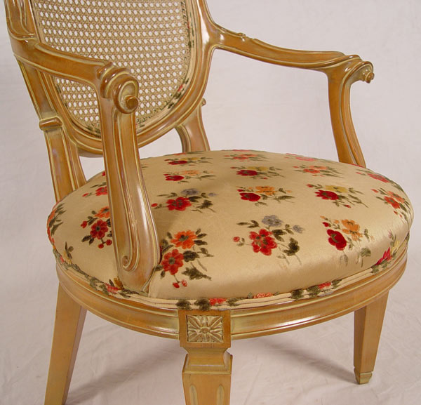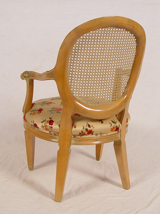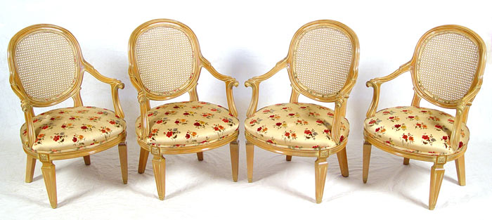 SET OF 4 FRENCH STYLE CANE BACK CHAIRS: Patinated blonde wood, flocked floral fabric seat. 34 1/2'' tall x 23'' wide x 22'' deep.