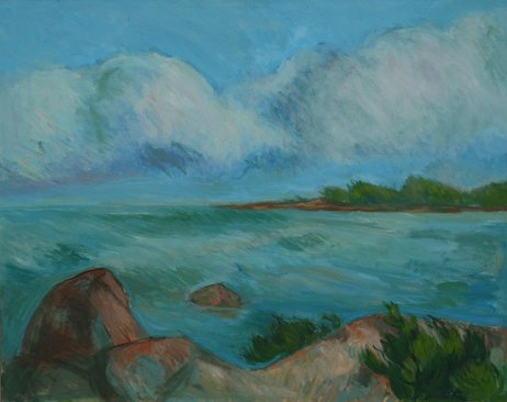 LYNN, Nancy, (American, 1920-2008): Tropical Inlet, Acrylic/Canvas, 33'' x 42''. Lynn studied art in Philadelphia, was an instructor at University of Tampa and Berkley and exhibited at The Peachtree Gallery in Atlanta.