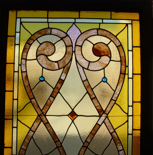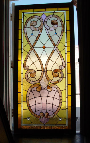 LARGE STAINED GLASS PANEL: 75'' x 35 1/4'' overall. Shades of amber and violet, framed in oak.