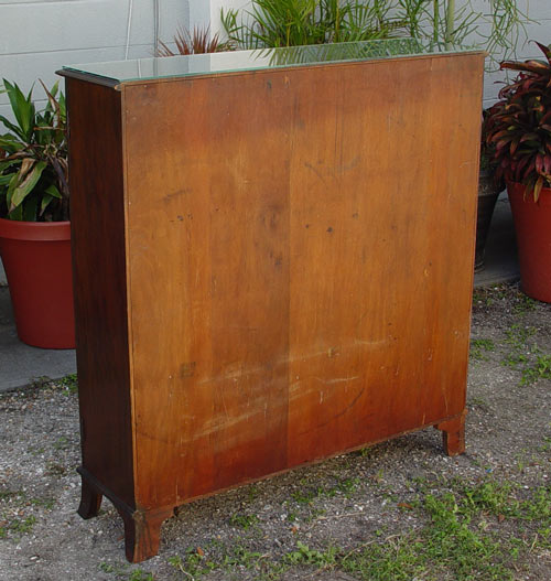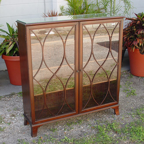DOUBLE DOOR GLASS FRONT MAHOGANY BOOKCASE: Wood lattice over the glass, adjustable shelves, splay feet. 48''h. x 45 1/2'' x 12 1/2''.