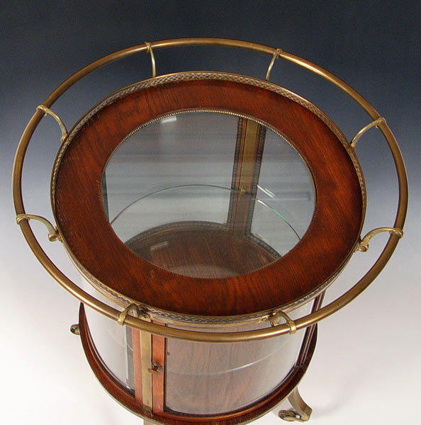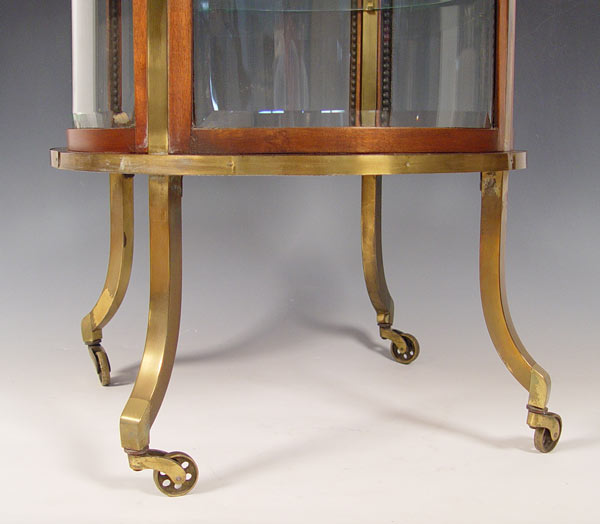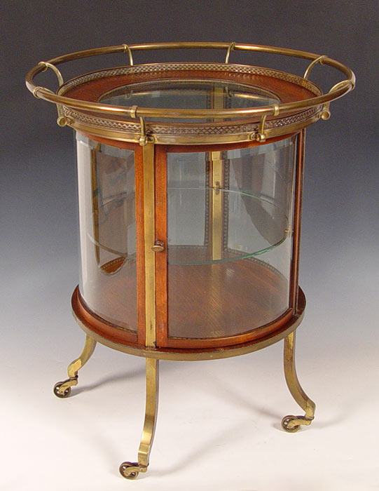 ROUND GLASS, BRASS AND OAK VITRINE / TROLLEY: Four beveled glass panels, one is hinged and used as a door. Fitted with interior glass shelf, topped with brass gallery and hand rail, brass legs and castors. 29 3/4'' tall x 24 1/2'' dia.