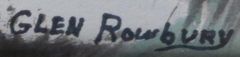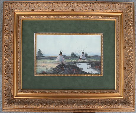 ROWBURY, Glen, (American, 20th C.): Indian Encampment by a stream, Gouache, sight size 6 1/2'' x 11 1/2'', signed, encased in contemporary carved and gilded molding, 18 1/2'' x 23 1/2''.