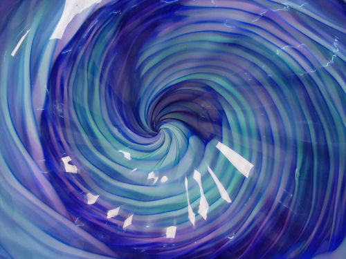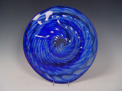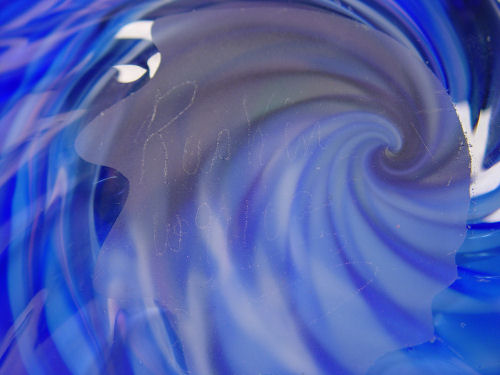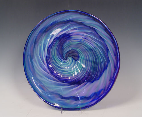 CONTEMPORARY ART GLASS BOWL SIGNED RUSKIN: Swirls of blue and violet. 19'' dia.