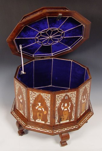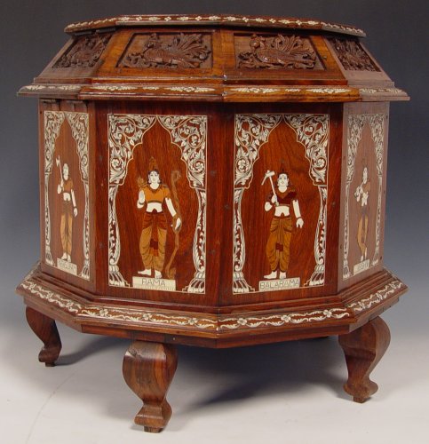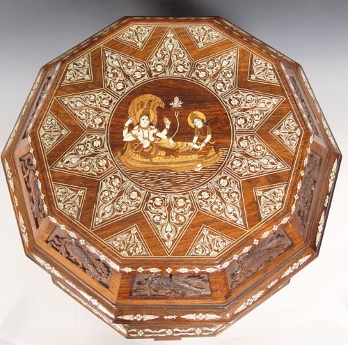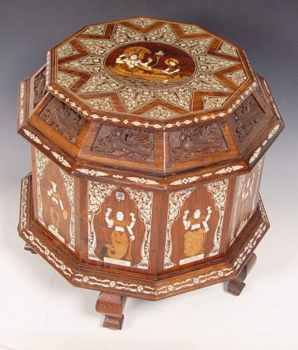 10 SIDED PERSIAN / INDIAN INLAID AND CARVED DOUBLE LIFT TOP STAND: Two hinged velvet lined storage compartments. Each of the ten panel sides displays the bone or ivory inlay image of a deity. 22''h X 24'' dia.