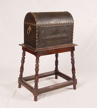WILLIAM AND MARY STYLE 1920'S DOME TOP HUMIDOR ON STAND: Leather cover and tacks, copper lining. Humidor attached to stand with turned legs. Measures 34 1/2'' h. x 22'' x 13''.