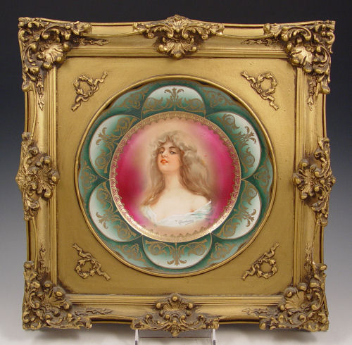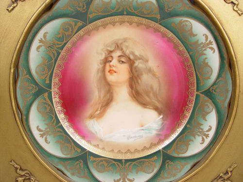 VIENNA AUSTRIA PORTRAIT PLATE: Moritz Zdekauer, Ca. 1884-1909. Transfer design of a blond beauty signed Constance, the artist or the subject?. Plate is 9 1/2'' dia. Framed in a gilt resin frame, 15 1/2'' square.