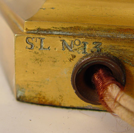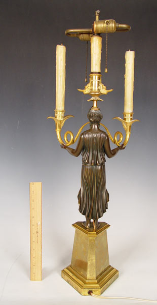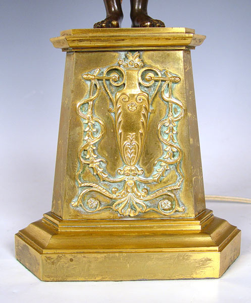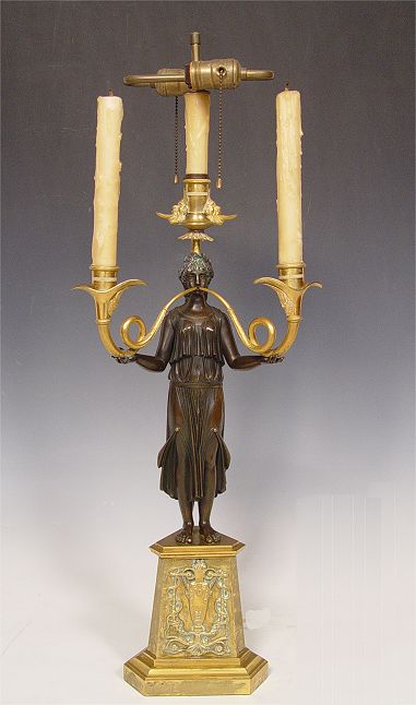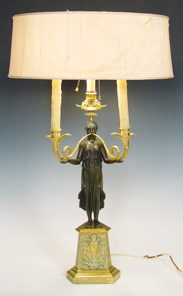 BRONZE FIGURAL LAMP ROMANESQUE WOMAN STAMPED S.L.: Romanesque maiden form holding and blowing 2 horns, on pedestal with heraldic shield adornment. Stamped on base S.L. No.13. Base 24'' h. x 7'' x 6''. Overall 32 1/2''h.