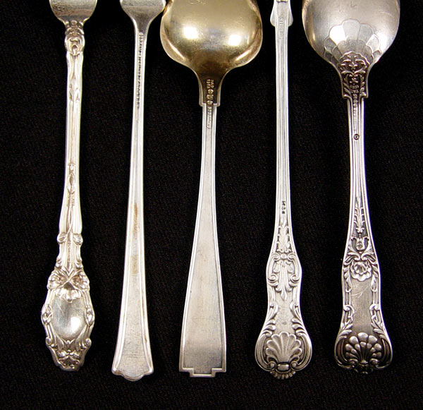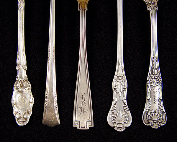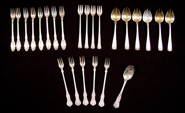 24 PIECE COLLECTION GORHAM STERLING FORKS: Includes 6 ice cream forks in the Etruscan pattern (5 1/4'', monograms), 17 shrimp forks in 3 separate patterns (5 1/2'', 12 monogrammed). Set also comes with monogrammed silver plated spoon (5 1/2''). Approx 12.9 troy oz.