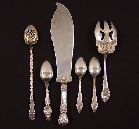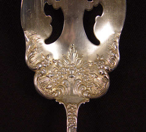 6 PIECE COLLECTION ORNATE STERLING FLATWARE: To include 2 Reed & Barton spoons in the Les Six Fleurs pattern (5 3/8''), Whiting solid fish server in the King Edward pattern (11 3/4''), Whiting spoon in the Lily pattern (5 3/4''), Whiting extra long spoon with pierced bowl in the Louis XV pattern (9 1/8''), Illegible maker serving fork (8''). All pieces monogrammed. Approx. 10.5 troy oz.