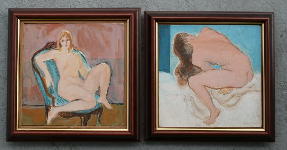LYNN, Nancy, (American, 20th C): Pair of Reclining Nudes, OIL/Canvas, 10'' x 10'', one is signed, framed, 12'' x 12''. Lynn studied art in Philadelphia, was an instructor at University of Tampa and Berkley and exhibited at The Peachtree Gallery in Atlanta.