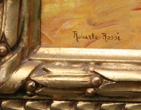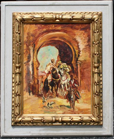 ROSSI, Roberto, (Argentina, 1896-1957): Orientalist Moroccan street scene with men on horseback, OIL/Board, 15 1/2'' x 12'', encased in painted, gilded and carved frame with wear, 22'' x 18''.