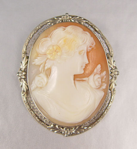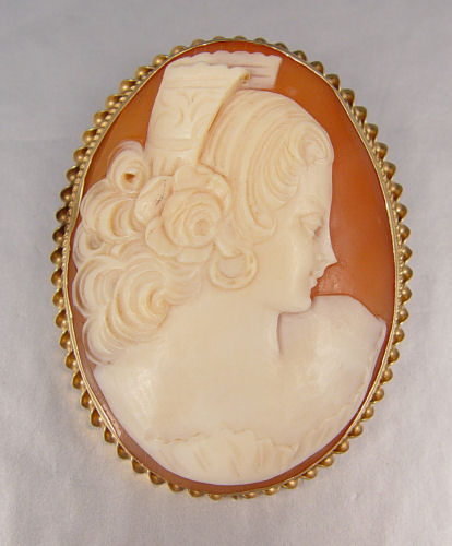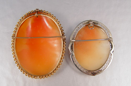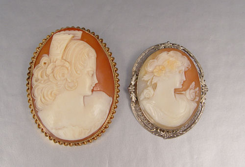 2 GOLD CAMEO BROOCH PENDANTS: 1) 14K spiral frame contains one shell cameo depicting a Spanish lady in profile. Bar pin and pivot bail. Approx. 2'' x 1 1/2''. 2) 14K filigree frame contains one shell cameo depicting a Victorian lady in profile. Bar pin and pivot bail. Approx. 1 1/2'''' x 1 1/4'' Gold Weight: 8.0 grams Approx.