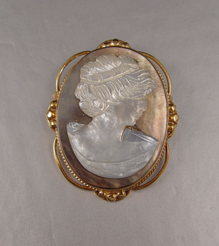 14K ABALONE SHELL CAMEO: 14K yellow gold scalloped frame contains one assembled abalone shell cameo depicting a Grecian lady in profile. Bar pin and pivot bail. Gold Weight: 5.0 grams Approx. 1 1/4'' x 1 1/2''