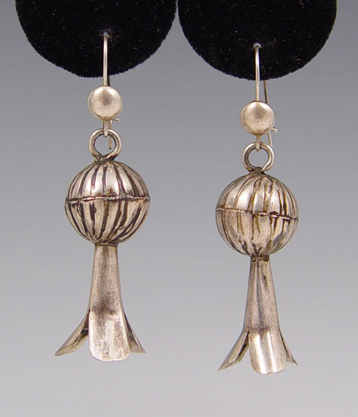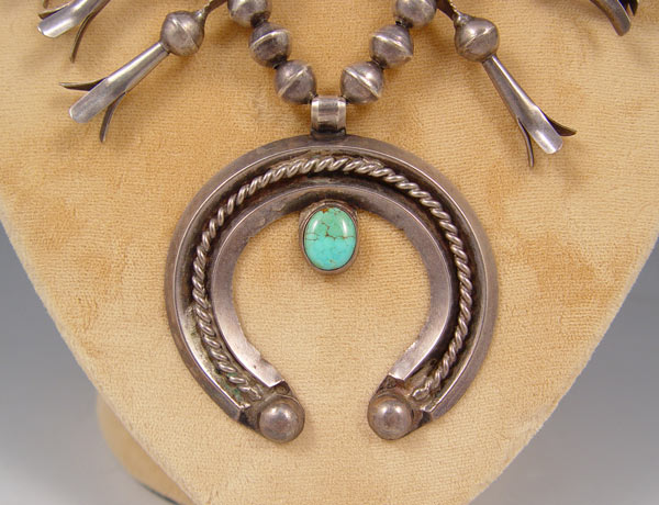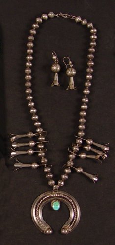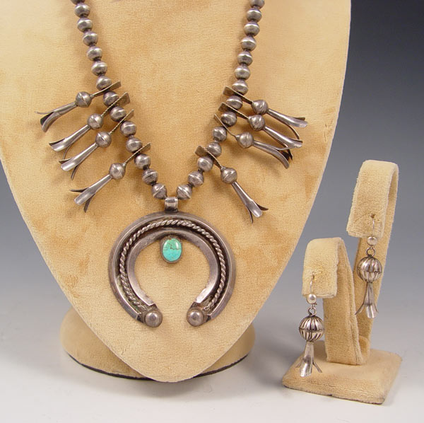 NATIVE AMERICAN SQUASH BLOSSOM NECKLACE AND EARRINGS: Silver bead necklace with simple naja centered by one oval turquoise, 2 3/8'' x 2 1/2'', with four blossoms to each side and matching pierced dangle earrings, necklace 11 1/2'' top to bottom, 19''l.
